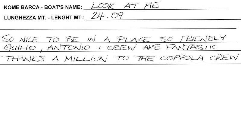 So nice to be in a place so friendly. Giulio, Antonio + crew are fantastic. Thanks a million to the Coppola crew.